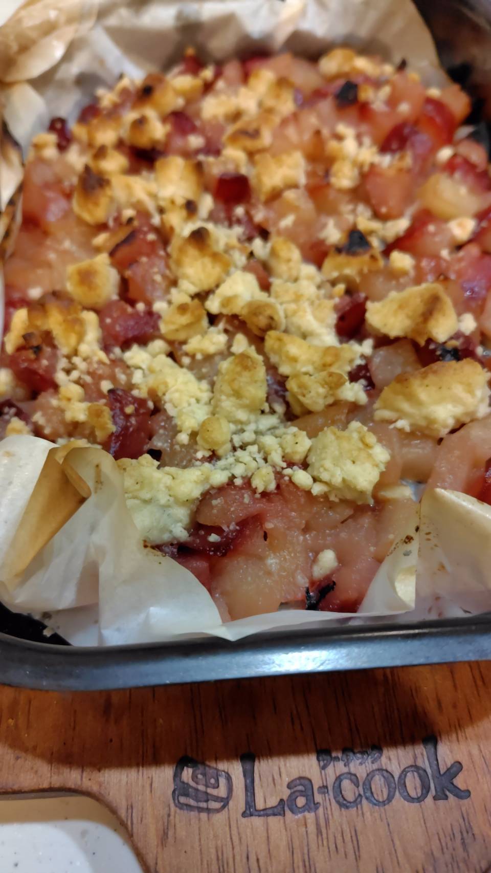 リンゴをバターと砂糖で炒めてクッキングシートを敷いたラクックへ入れます。クッキー生地を手でざっくりとそぼろ状にしてリンゴに乗せたら